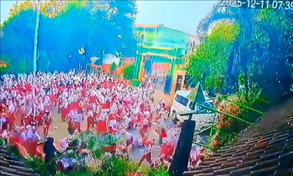 Alhasil, gerbang sekolah pun jebol. Dalam rekaman itu, mobil Van itu membanting setir ke kiri menuju arah barisan siswa yang sedang duduk.