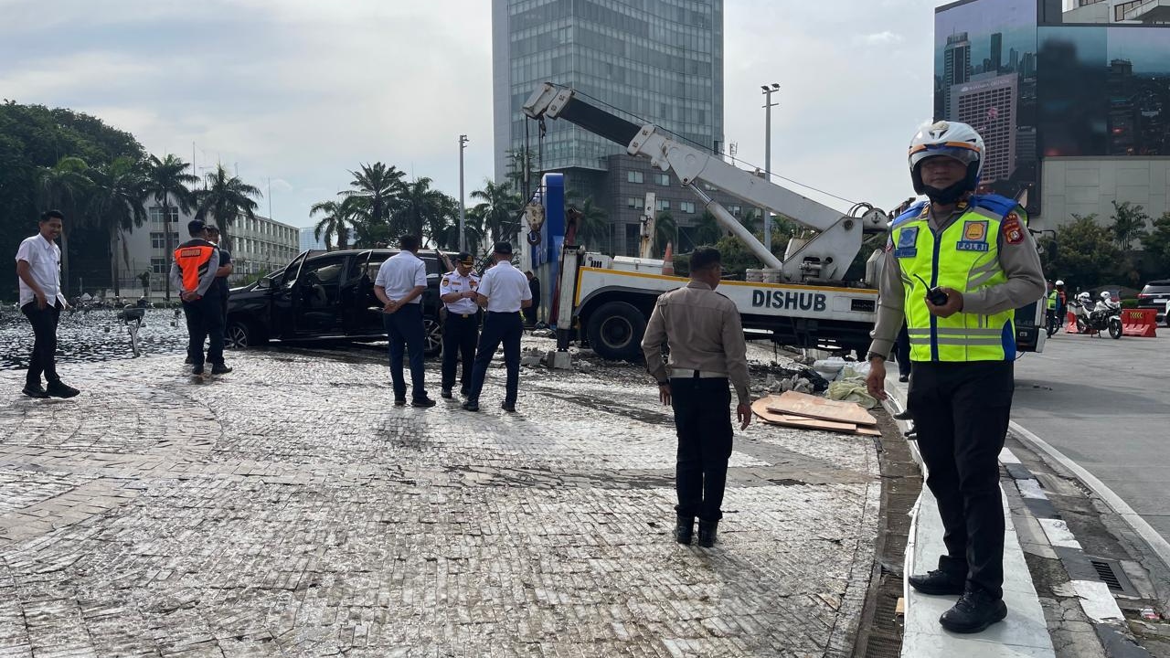 Setelah menabrak pembatas jalan, mobil BYD terpental hingga tercebur ke dalam kolam air mancur Bundaran HI.