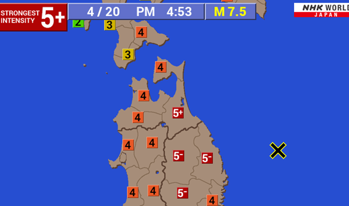 Begitu gempa yang terjadi pada Senin 20 April sekitar pukul 14:53 waktu setempat dengan pusat gempa di lepas pantai Sanriku Miyako Timur 100 km / 10 km / M 7.4.