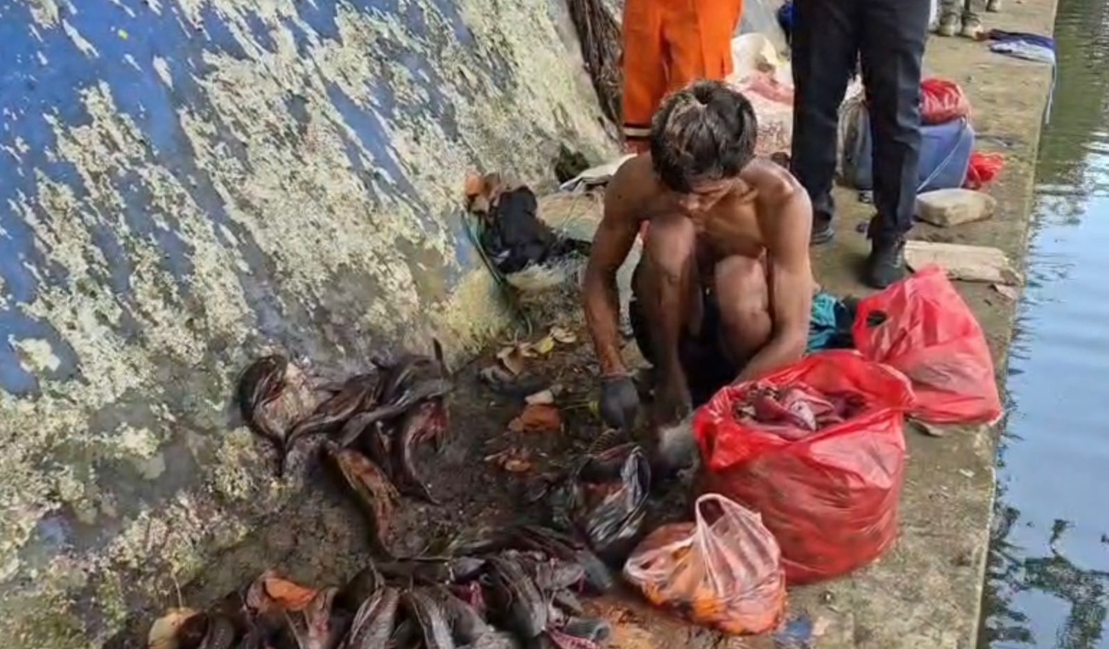 Mereka dipergoki sedang memfilet ikan sapu-sapu di bantaran Anak Kali Ciliwung, Pasar Baru.