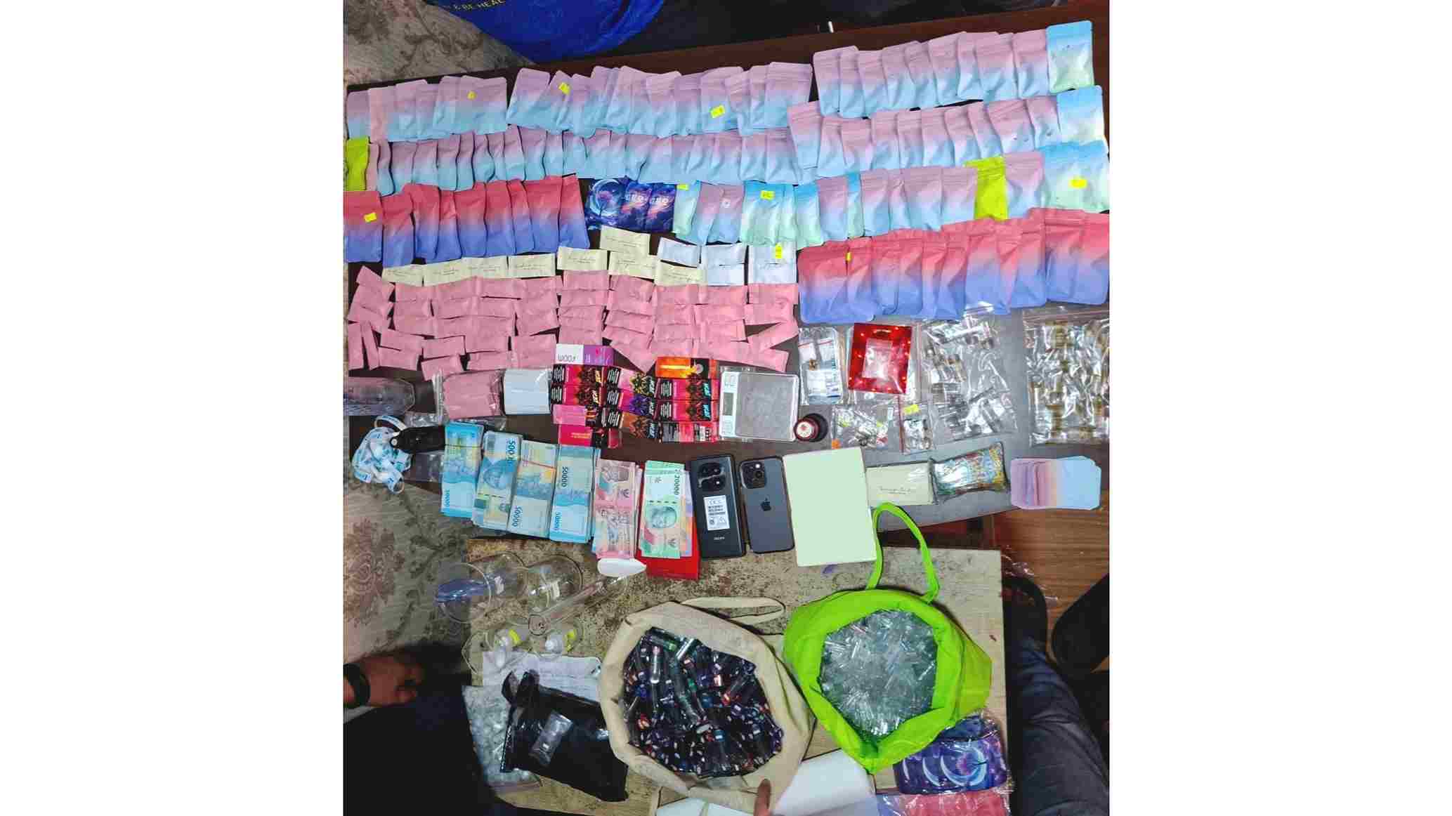 Dijelaskannya, selain ratusan cartridge siap edar, pihaknya juga mengamankan barang bukti lain berupa cairan Etomidate dalam botol, alat produksi sederhana, serta bahan campuran perasa.