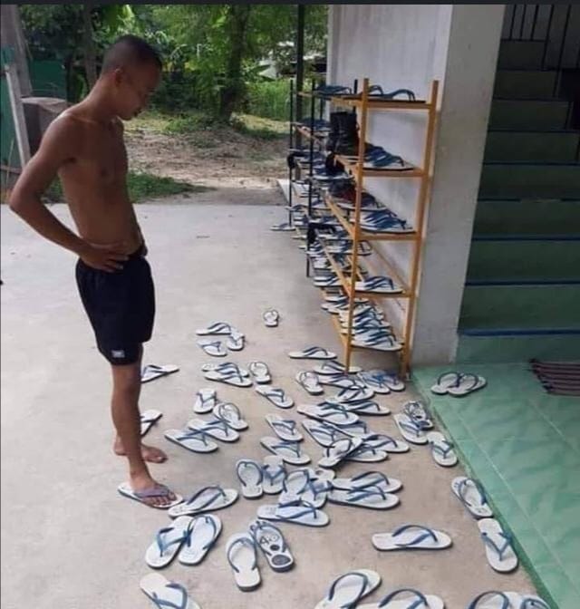 Saya dapat kiriman foto. Seorang lelaki muda lagi termangu berdiri di tengah banyak sandal jepit yang berserakan. Ia seperti bingung mencari-cari mana pasangan sandal untuk kaki kirinya.