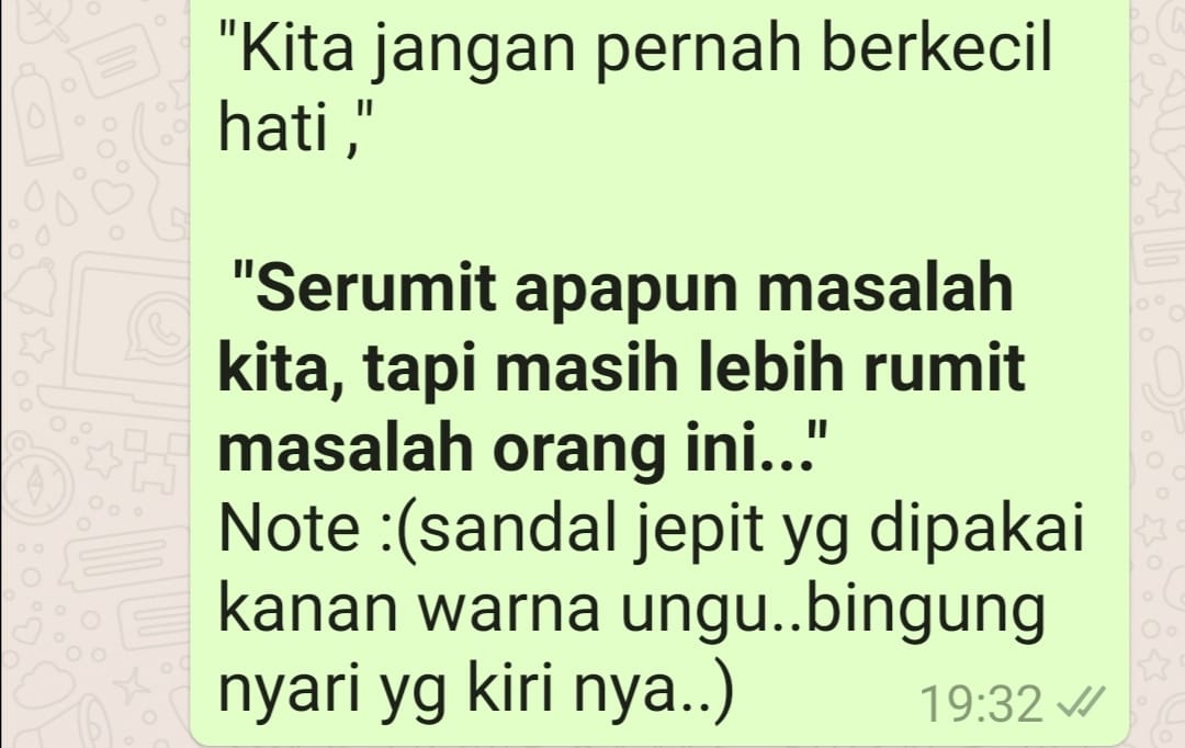 Di bawah foto itu disertakan teks: Jangan kecil hati. Serumit-rumit problem Anda masih rumit problem orang itu.
