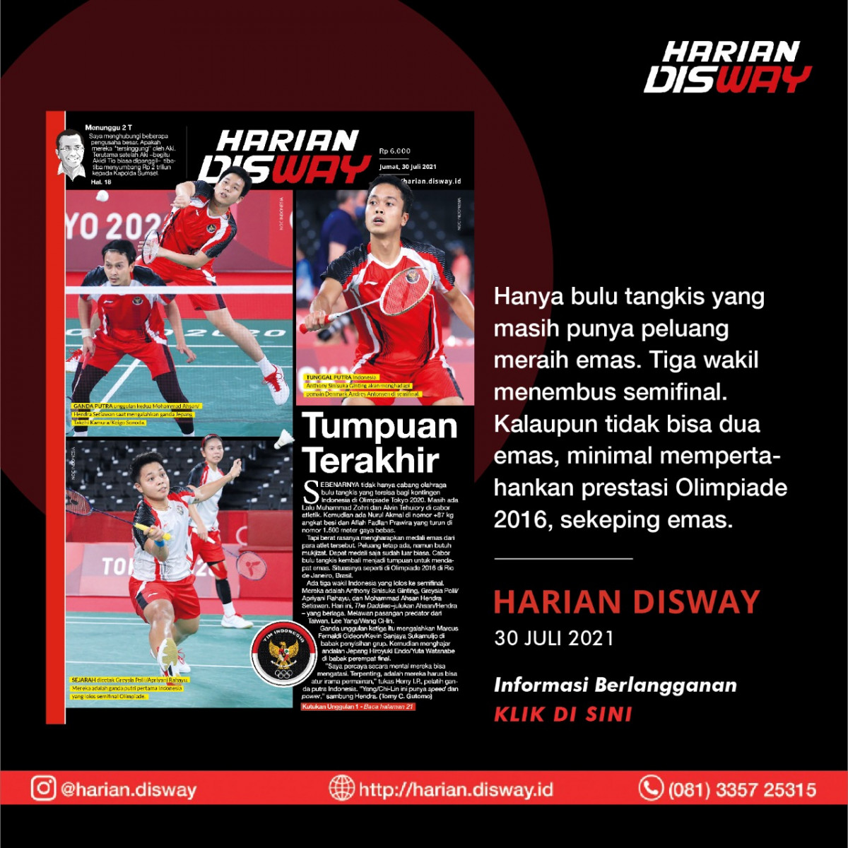 Hanya bulu tangkis yang masih punya peluang meraih emas. Tiga wakil menembus semifinal. Kalaupun tidak bisa dua emas, minimal mempertahankan prestasi Olimpiade 2016, sekeping emas. Selengkapnya baca Harian Disway edisi 30 Juli 2021. Info berlangganan klik.