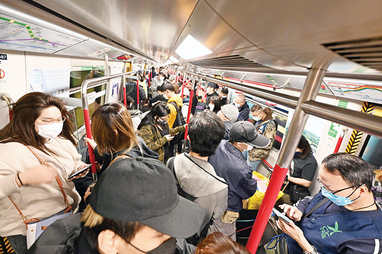 KERETA BAWAH TANAH yang penuh penumpang, Jumat (18/2) ini ditengarai membuat penularan Covid-19 di Hong Kong masih tetap tinggi.