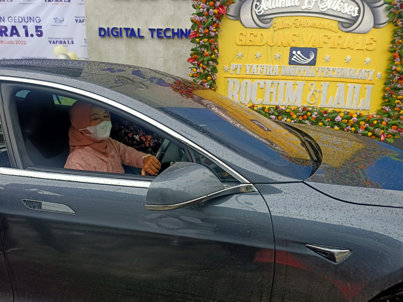 Aza merasakan mengendarai Tesla Model S milik Disway.