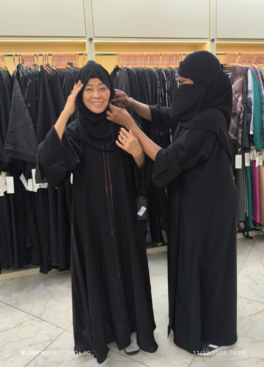 Tiba di halaman Masjidilharam saya lihat Ny Bambang pakai kerudung model kerudungnya Bu Sinta Nuriyah-nya Gus Dur. Tidak bisa untuk salat. Maka kami masuk mal di bawah Clock Tower yang di halaman masjid itu. Beli abaya. Sekalian minta petugas toko memakaikannya. Foto dia sedang pakai abaya saya kirim ke Galuh Banjar. Mereka berteman baik. Lalu titip salam. Menantu Pak Iskan itu tidak iri tidak diajak ke Makkah --toh tiga bulan lagi tidak lama.