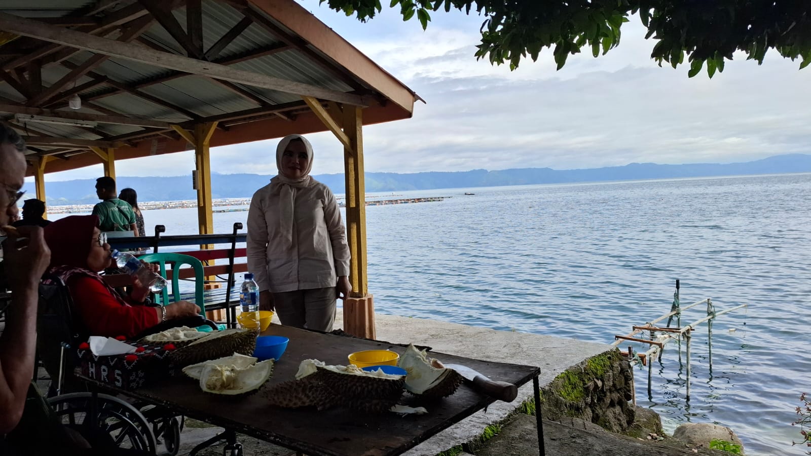 Kami berhenti di tepian danau. Di gasebo-gasebo sederhana milik sebuah restoran keluarga Mayjen Polisi Purn Sihaloho. Kami permisi makan durian di situ. Tentu kami tahu diri: harus memesan ikan bakarnya dan sambal khas Bataknya. Kami sarapan sambil menunggu datangnya waktu salat Jumat.