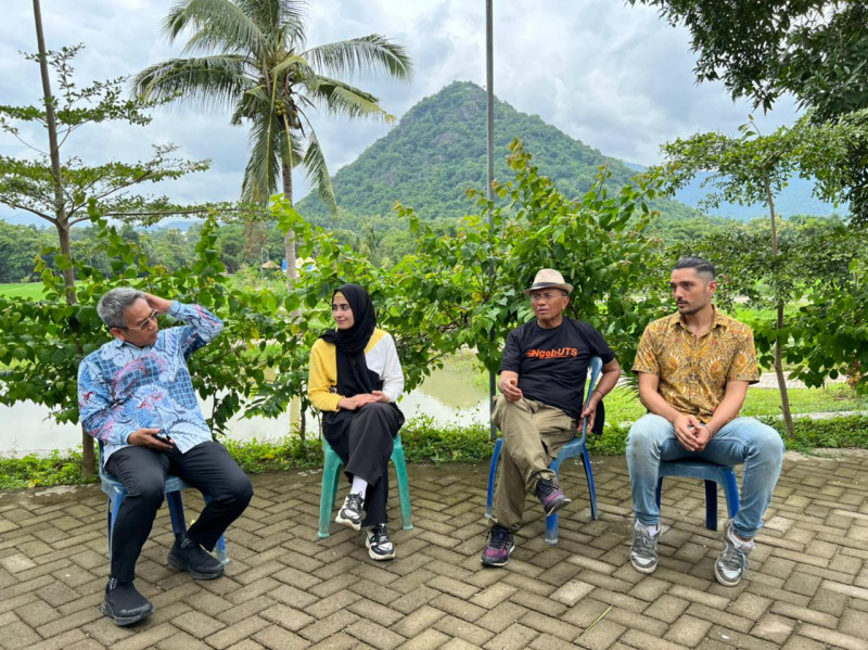 BINCANG santai (dari kiri) Rektor UTS Chairul Hudaya, mahasiswi asal Lebanon Nurul Huda, Disway, dan mahasiswa asal Argentina Mauro Nicolas Scabuzzo. Dengan latar belakang bukit Olat Maras.