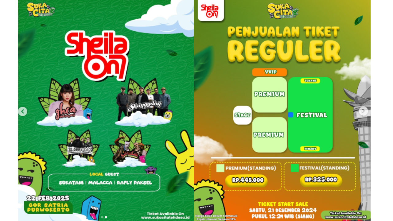 Penjualan tiket reguler konser Sheila On 7 di Purwokerto Februari 2025 dijual Sabtu, 21 Desember 2024 dengan dua kategori berbeda. Berikut rinciannya: