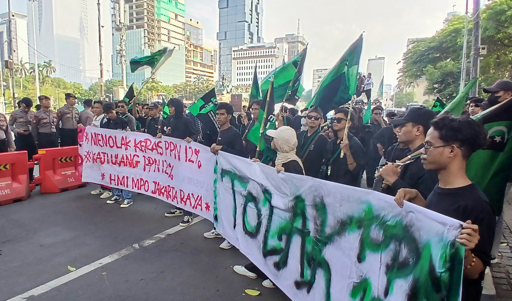 "Untuk aksi hari ini kita jelas menolak terkait PPN 12% karena kita melihat kebijakan ini sangat tidak menguntungkan bagi masyarakat bahkan terkesan bisa dikatakan ini salah satu penindasan pemerintah kepada masyarakat," kata Ketua HMI Cabang Jakarta Selatan, Fadlan di lokasi.