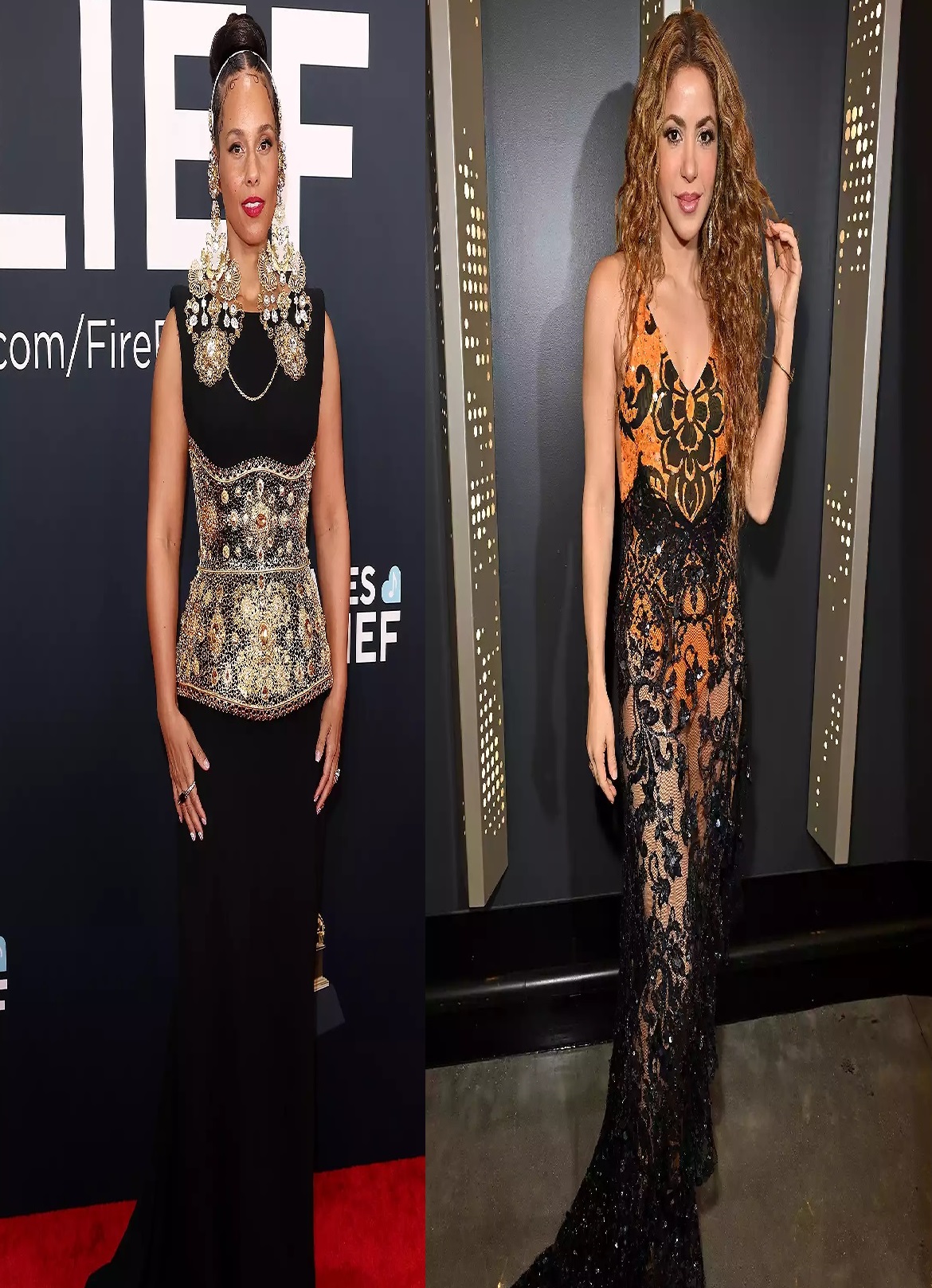 Shakira memilih desain memukau dari Etro, yang terdiri dari bodysuit neon oranye dan hitam serta rok renda dan payet, dilengkapi dengan perhiasan Pomellato. Rambut ikalnya yang ikonik pantas mendapatkan penghargaan tersendiri!