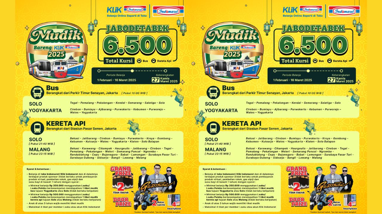 Bertajuk 'Mudik Bareng Klik Indomaret 2025' warga perantau di Jabodetabek bisa mengikuti program tersebut dengan tiga rute tujuan yakni Solo, Yogyakarta, dan Malang.