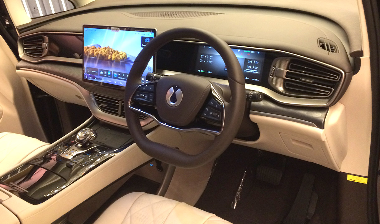 Sistem DiLink menghadirkan pengalaman interaktif dengan layar utama 15,6 inci, panel instrumen MID 10,25 inci, serta layar kontrol di sandaran tangan kursi tengah.