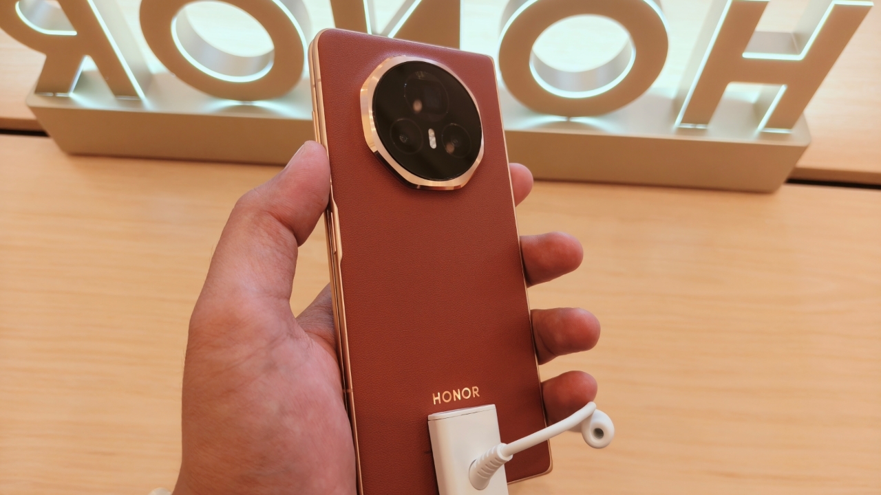 Desain bodi belakang HONOR Magic V3 cukup mewah dengan lapisan kulit, kamera berdesain prisma segi delapan beraksen krom.-Dimas/Disway.id-
