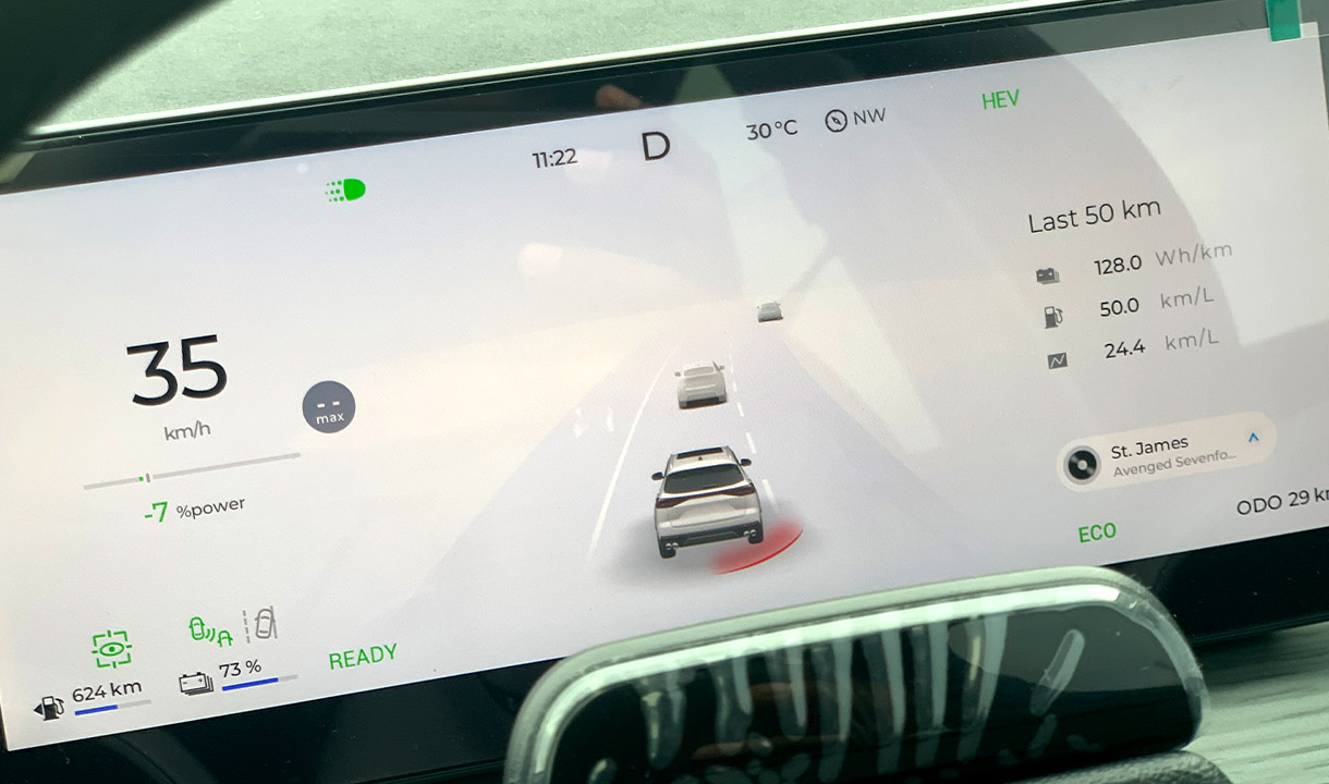 Kondisi BBM dan baterai penuh yang mampu menjelasah hingga 1.300 km, namun dari tindikator MID, konsidi BBM ditangki lebih dari setengah dan posisi baterai pada 73 persen, menunjukan jarak tempuh yang masih dapat ditempuh masih 624 km -reza-