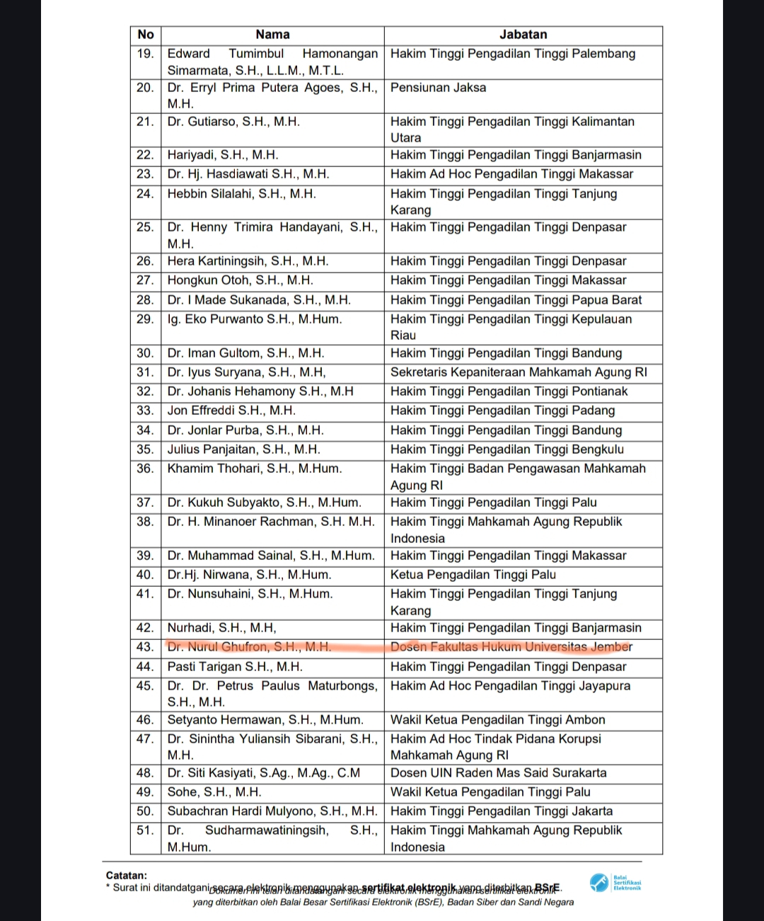 Total 69 calon hakim agung kamar pidana yang lolos dalam seleksi di mana nama Nurul Ghufron masuk di nomor 43.