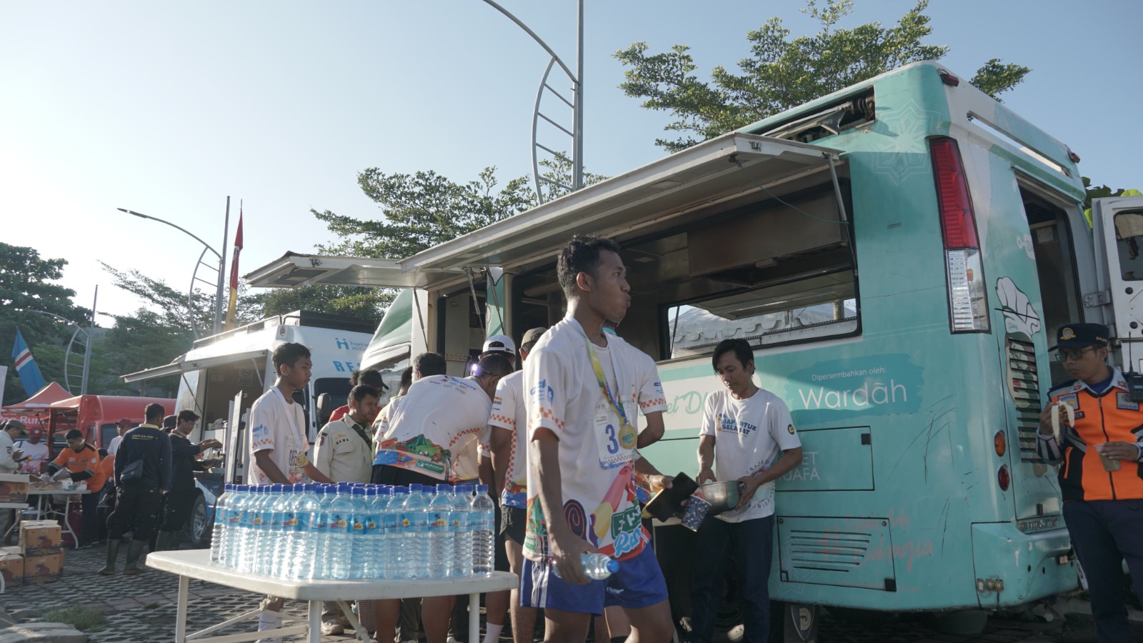 Di water station, peserta tidak hanya menuntaskan dahaganya dengan air mineral dingin, tetapi juga menikmati kudapan-kudapan sehat dan bergizi, seperti ragam buah potong ataupun telur rebus.