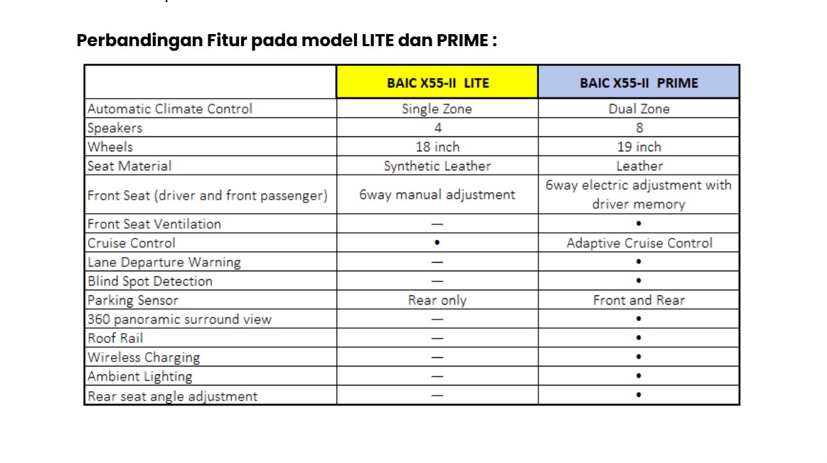 Perbandingan fitu BAIC X55 II 2025 di model Lite dan Prime-Dimas/Disway.id-