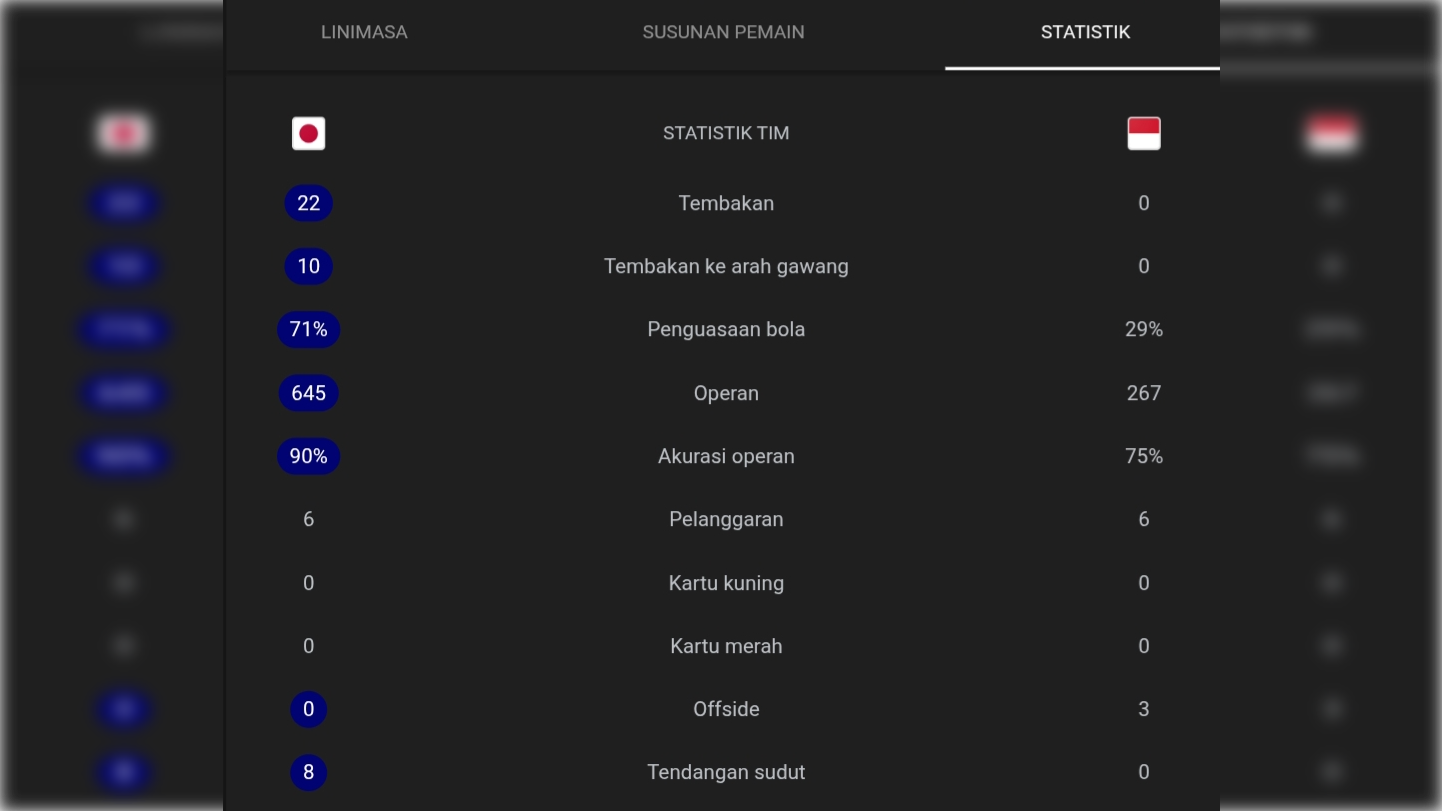 Mengutip sata FootyStats, Jepang melepaskan 21 tembakan dengan 11 di antaranya mengarah ke gawang. Sementara Indonesia, tak ada satu tembakan yang mengarah ke gawang.