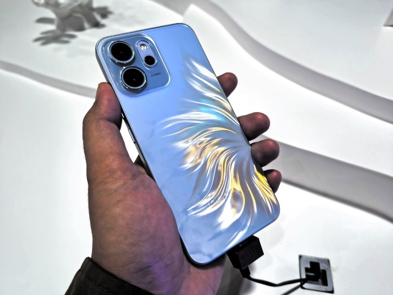 Desain ini disebut yang pertama di dunia smartphone, back cover HP ini sekilas berkilau dengan warna-warni yang berubah-ubah tergantung sudut pandang kita.