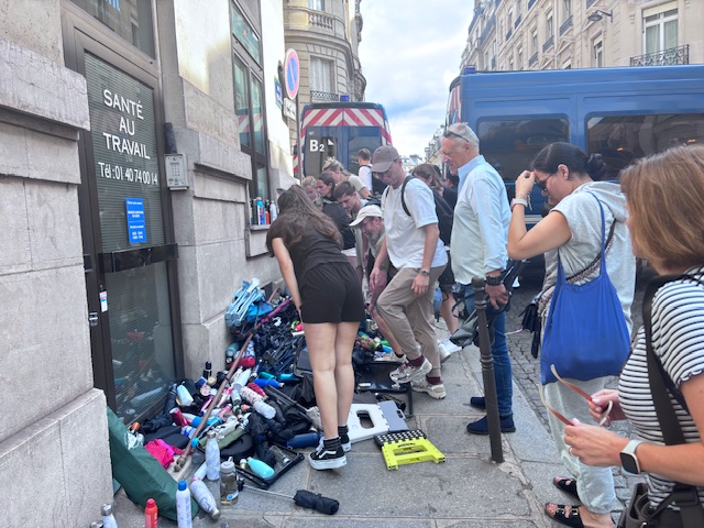 Ratusan benda dikumpulkan di setiap sudut pintu masuk ruas jalan ke Avenue de Champs-Elysee, tempat Bastille Day 2025 berlangsung, Senin 14 Juli 2025. Polisi melarang setiap orang yang menonton membawa benda ya-disway.id/tri broto-