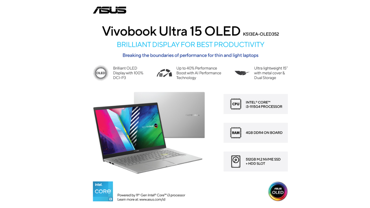 Layar 15,6 inci OLED Full HD resolusi 1920 x 1080 menyajikan visual tajam, sudut pandang luas, serta fitur anti-silau yang nyaman di mata.