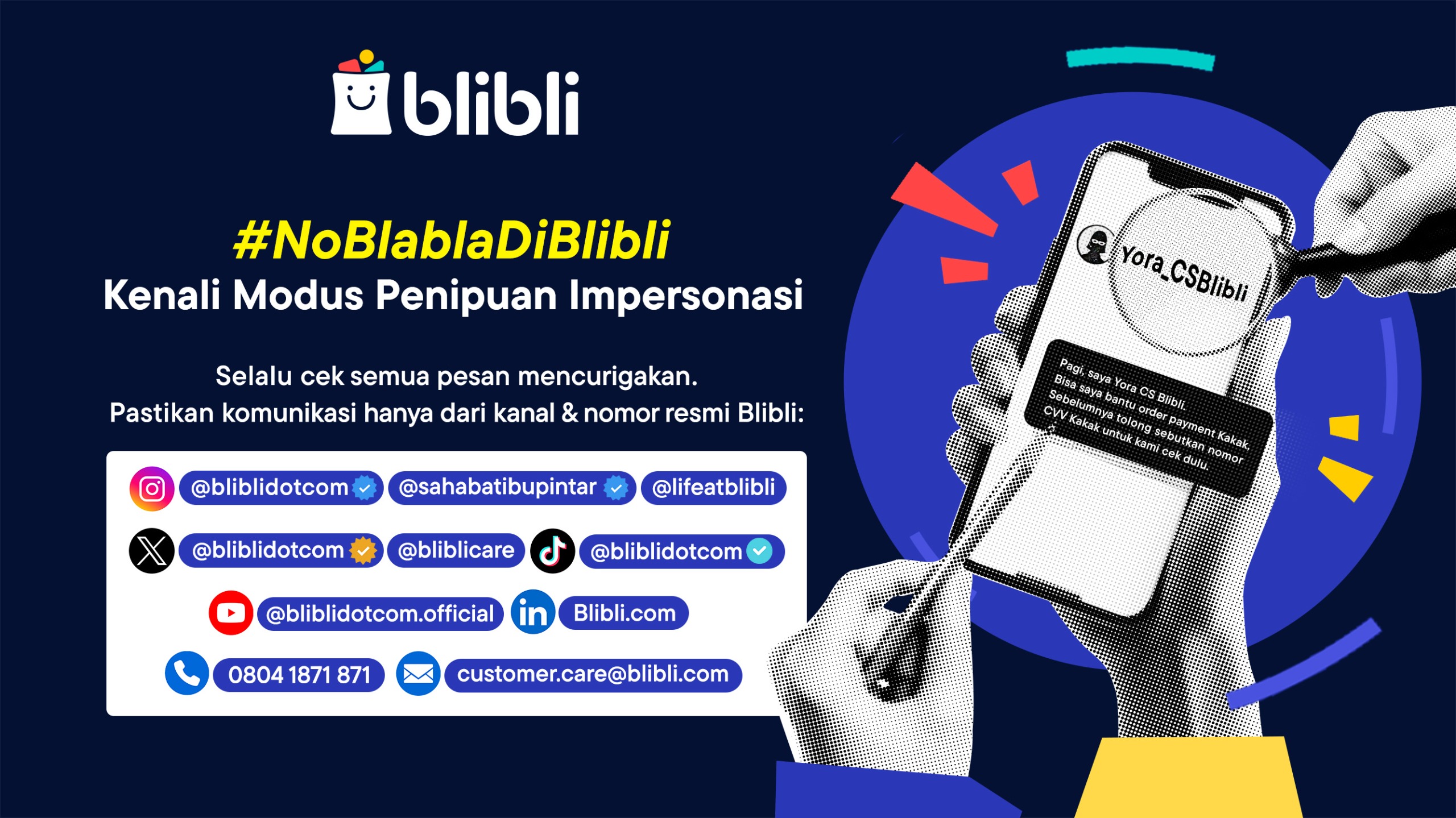 Terbaru, Blibli mengeluarkan peringatan resmi kepada masyarakat untuk waspada terhadap aksi penipuan bermodus impersonasi, di mana pelaku mengaku sebagai staf atau manajemen Blibli.