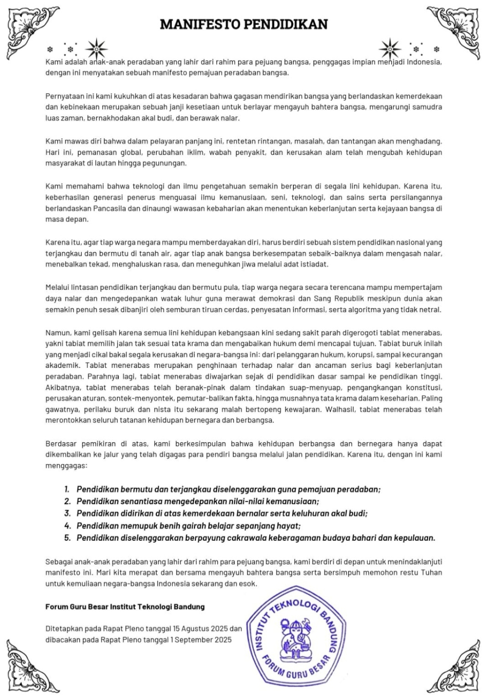 Guru Besar ITB Deklarasikan Manifesto Pendidikan, Menentang Tabiat Menerabas demi Peradaban Bangsa