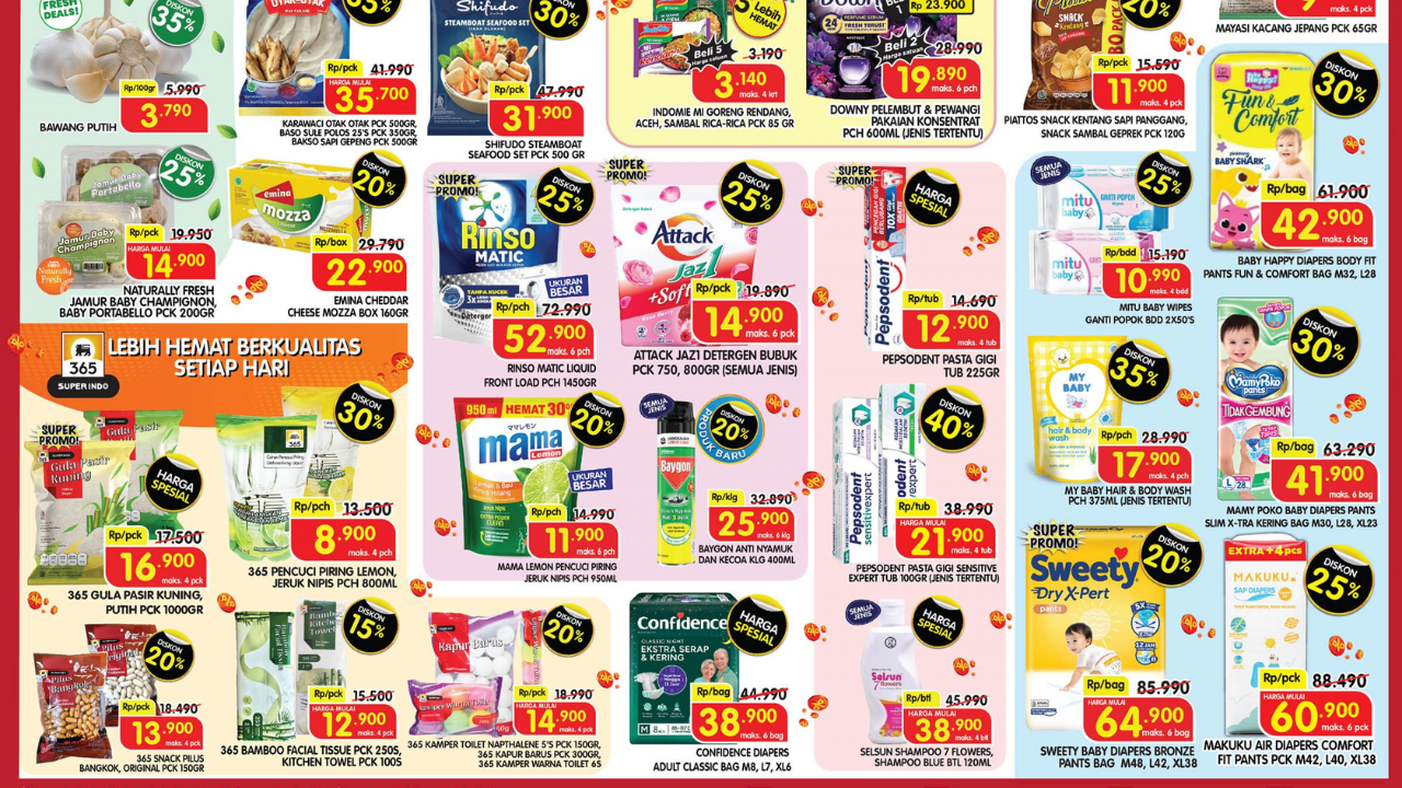 Dalam promo Superindo minggu ini 2025, berbagai produk yang diberikan potongan harga, yakni buah, frozen food, udang, daging, ayam, ikan, minyak goreng, beras, susu, diapers, detergen, hingga sabun pencuci piring.
