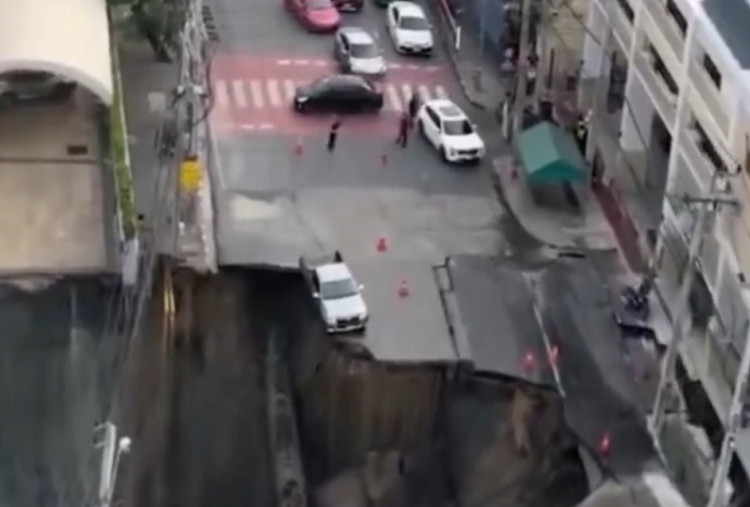 Rekaman video yang viral di media sosial menunjukkan pemandangan horor. Jalan empat lajur terbelah, truk polisi tergantung di tepi lubang, dan warga berlarian panik.