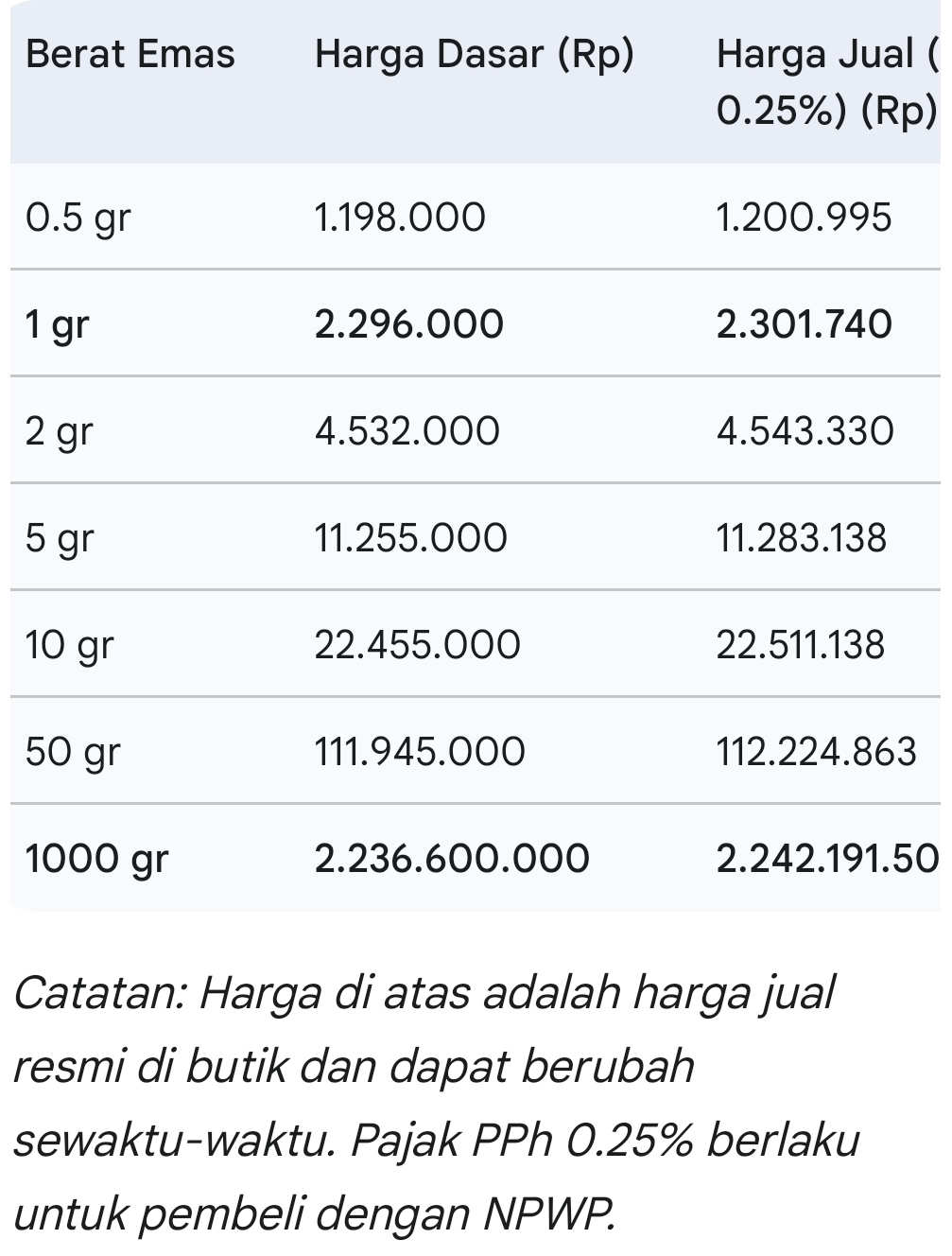 Kenaikan harga ini terjadi di seluruh denominasi emas batangan. Berikut adalah daftar lengkap harga emas Antam per 8 Oktober 2025 (sudah termasuk Pajak PPh 0,25%):