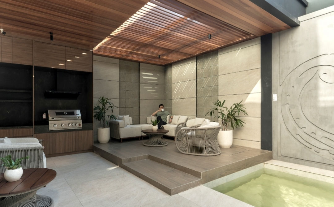 Arsitek di baliknya menggabungkan gaya modern kontemporer dengan elemen arsitektur tropis Bali, menciptakan ruang yang terasa hangat, alami, tapi tetap berkelas.