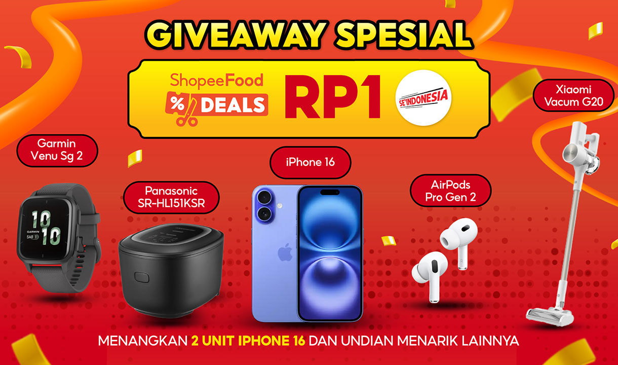 Pada periode ShopeeFood Deals November ini, para pengguna bisa memenangkan hadiah spesial, yaitu 2 unit iPhone 16, AirPods Pro Gen 2, Garmin Venu Sq 2, Panasonic SR-HL151KSR, dan Xiaomi Vacuum Cleaner G20. Ikuti langkah-langkah di bawah ini untuk menangkan hadiahnya:
