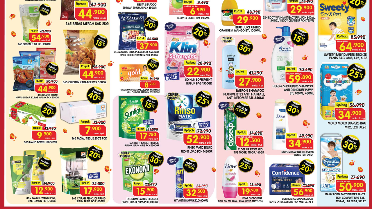 Promo Superindo minggu ini memberikan potongan harga untuk berbagai produk, mulai dari ayam, ikan, daging, buah, frozen food, kentang, minyak, susu, diapers, sabun mandi, shampoo, detergen, hingga sabun pencuci piring.
