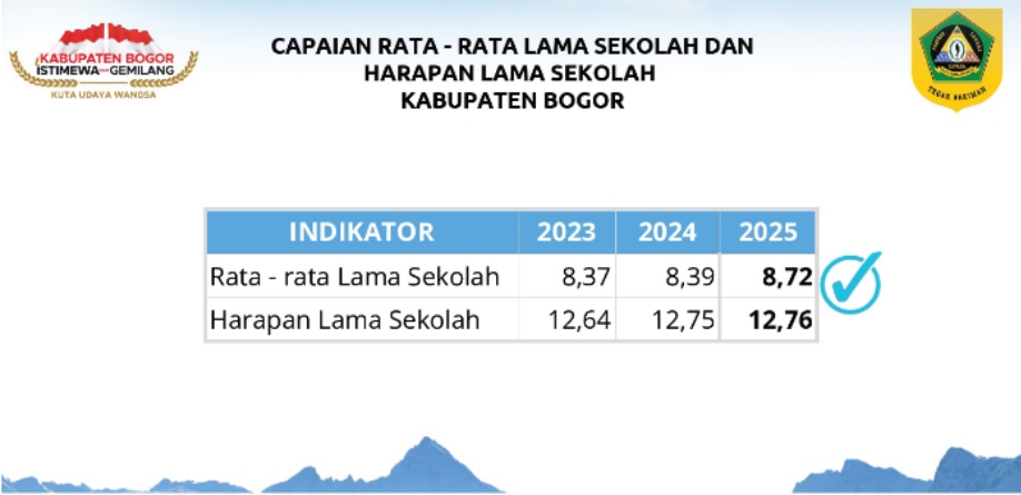 Capaian ini berkontribusi pada meningkatnya indikator Rata-Rata Lama Sekolah (RLS) dan Harapan Lama Sekolah (HLS) Kabupaten Bogor pada 2025.
