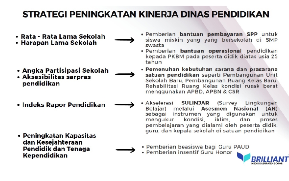Dalam laporan tersebut, Rusliandy menegaskan bahwa Dinas Pendidikan menjadi perpanjangan tangan Bupati Bogor dalam menjalankan amanat Peraturan Bupati Bogor Nomor 129 Tahun 2021 mengenai struktur organisasi, tugas, dan fungsi Dinas Pendidikan.