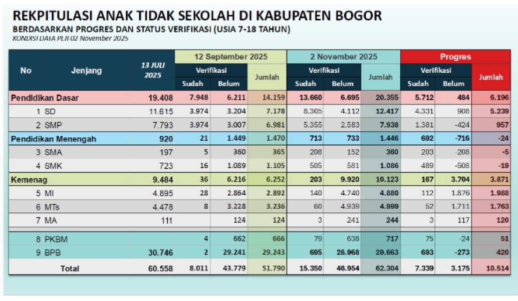 Salah satu program prioritas yang menunjukkan progres signifikan adalah Penanganan Anak Tidak Sekolah (ATS) yang dilaksanakan di seluruh 40 kecamatan.