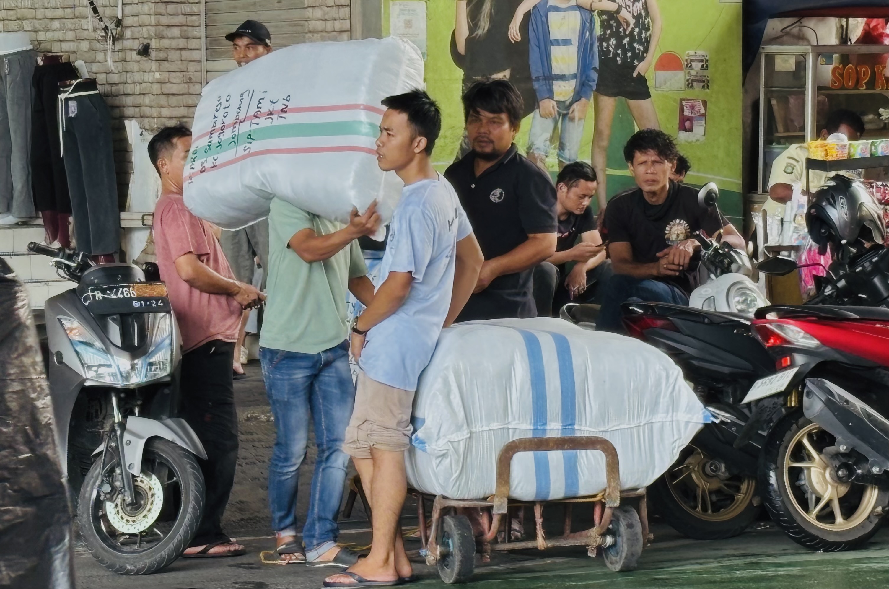 Dia mengaku sampai siang hari ini sudah mengangkut sekitar 10 bal dari Pusat Grosir Metro Tanah Abang.