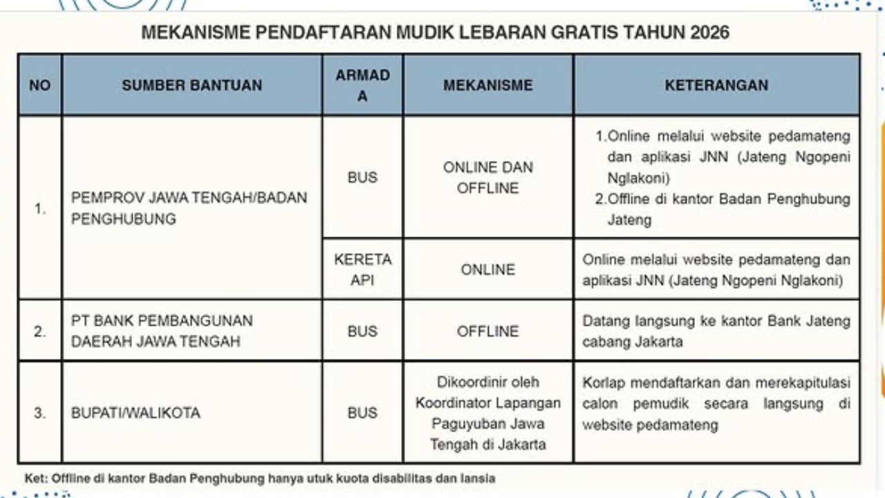 Pemerintah Provinsi Jawa Tengah membuka program mudik dan balik rantau gratis Lebaran 2026.