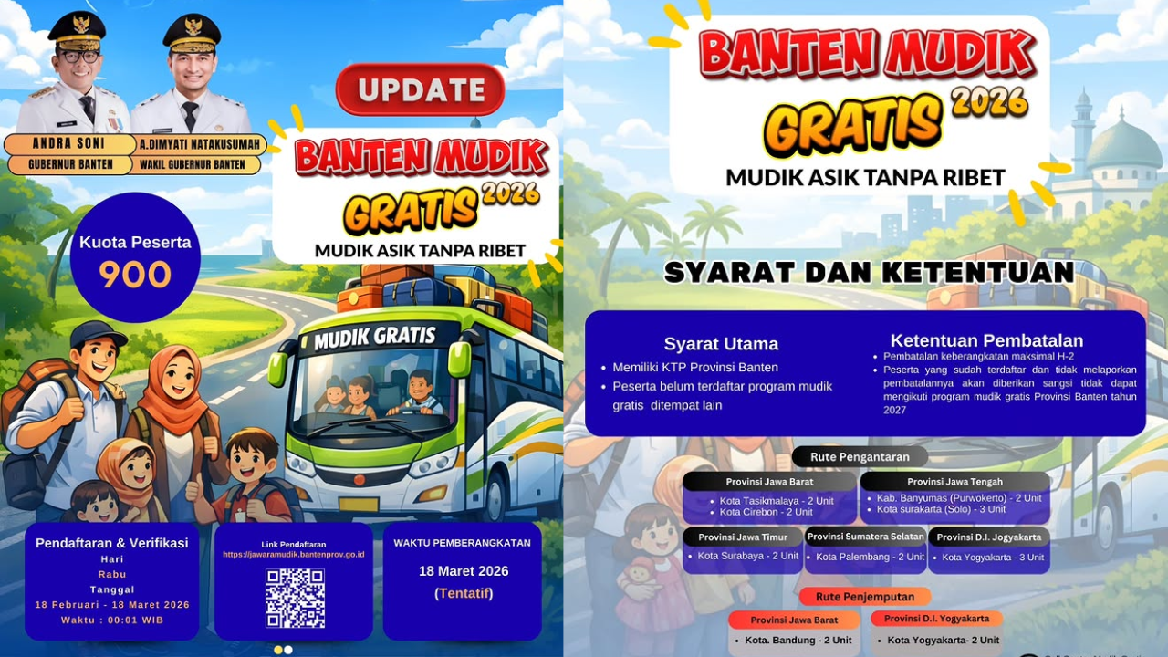 Pendaftaran mudik gratis Lebaran 2026 dibuka secara online melalui website resmi Pemprov Banten di https://jawaramudik.bantenprov.go.id.
