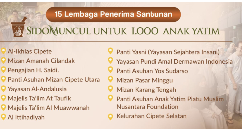 Pada hari itu, Sido Muncul kembali berbagi kasih di bulan suci Ramadan dengan menyalurkan santunan senilai Rp 200 juta untuk 1.000 anak yatim di wilayah Jakarta.