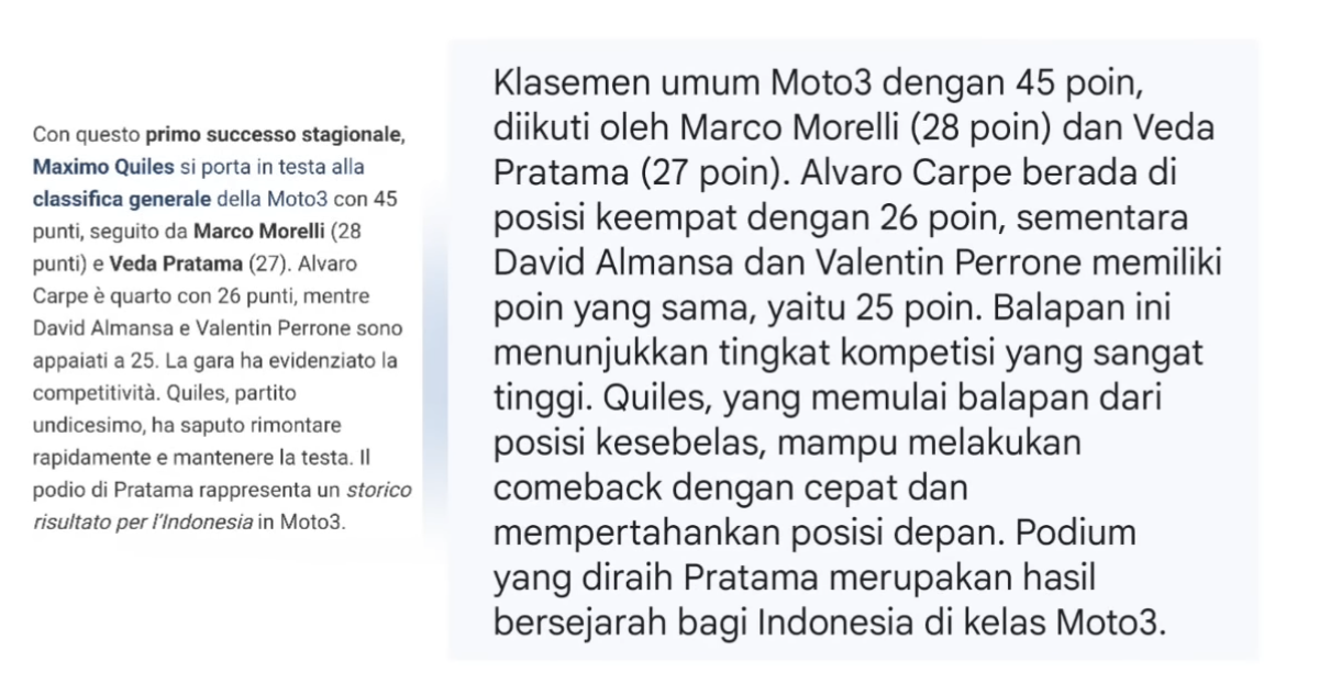 Dari Italia, komentar yang muncul menyoroti pencapaian luar biasa Veda yang langsung meraih podium di seri keduanya.