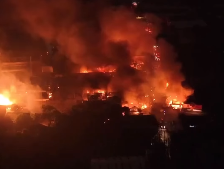Api tampak sangat merah membara membakar bangunan-bangunan yang juga berada di sekitar gudang elpiji.