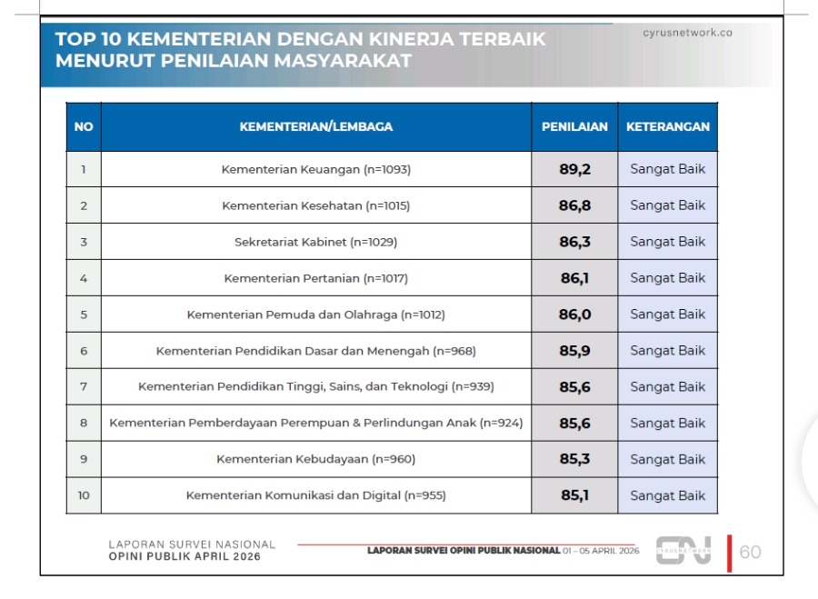 Survei ini juga memotret peringkat kementerian dengan kinerja terbaik di Kabinet Presiden Prabowo Subianto.