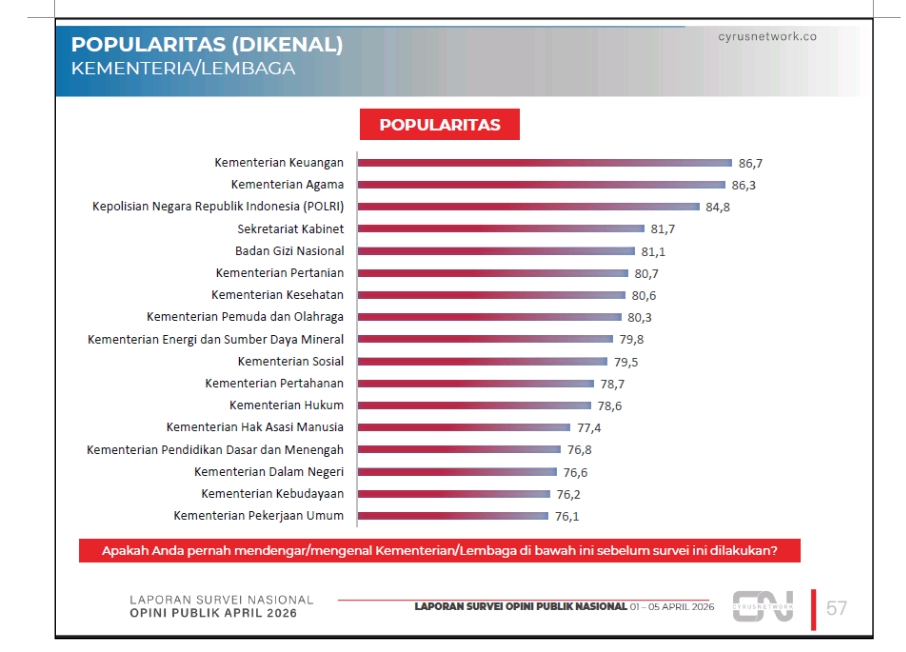 Survei juga mencatat popularitas kementerian. Hanya dua kementerian yang konsisten berada di lima besar baik untuk popularitas maupun penilaian kinerja, yaitu Kementerian Keuangan di peringkat pertama dan Sekretariat Kabinet di peringkat keempat.