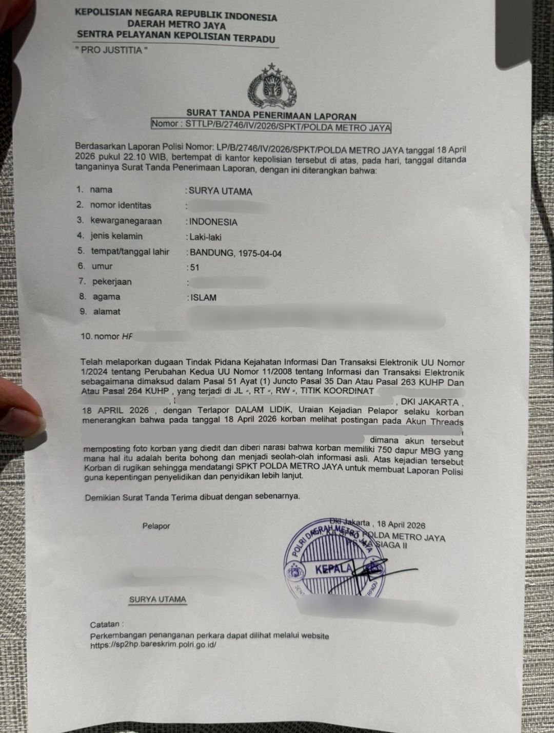 Berdasarkan Surat Tanda Penerimaan Laporan (STTLP) Nomor: STTLP/B/2746/IV/2026/SPKT/POLDA METRO JAYA, laporan dibuat pada 18 April 2026 pukul 22.10 WIB di Sentra Pelayanan Kepolisian Terpadu (SPKT) Polda Metro Jaya.